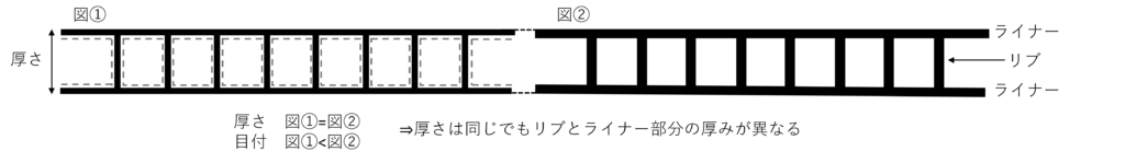 目付が大きくなると厚さは同じでもリブとライナー部分が厚くなり強度が増します。