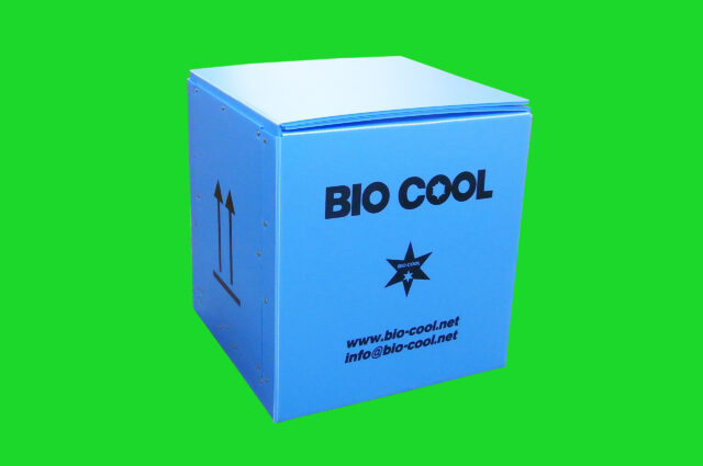 当社製品であるバイオクールは高性能の保冷容器ですが、発泡スチロールの弱点を補うべく、プライタで頑丈な外箔を作り、その中に厚壁の発泡スチロールをはめ込んだものです。