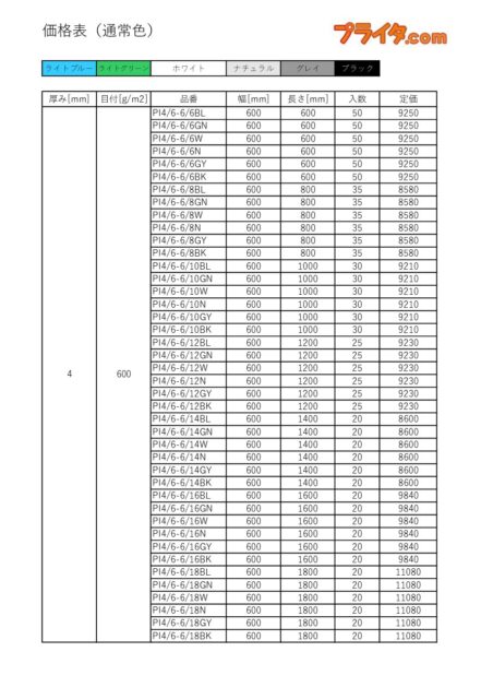 | 幅 (mm) | 長さ (mm) | 入数 (枚) | カラー(通常色) | |||||