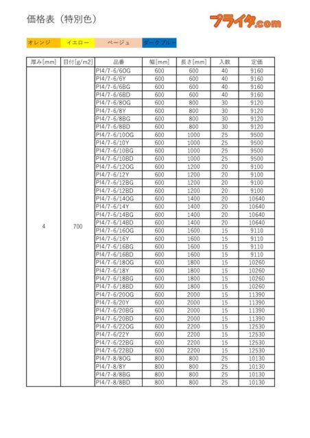 | 幅 (mm) | 長さ (mm) | 入数 (枚数) | カラー(特別色) | |||