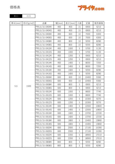 | 幅 (mm) | 長さ (mm) | 入数 (枚) | カラー | |